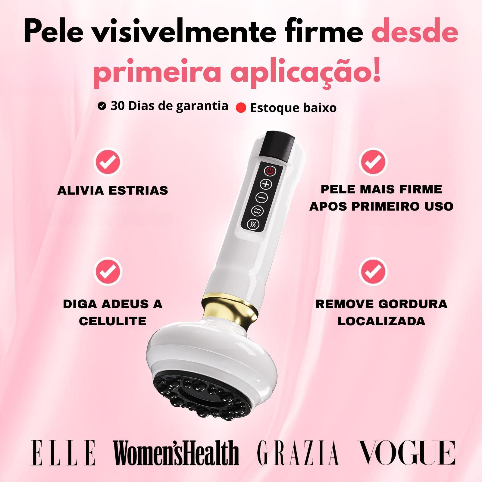 As 8 bolas de aço do massageador proporcionam massagem profunda nos tecidos, quebrando fisicamente os depósitos de gordura que formam a celulite1. Essa pressão e movimento consistentes ajudam a dispersar as células de gordura e suavizar a pele.